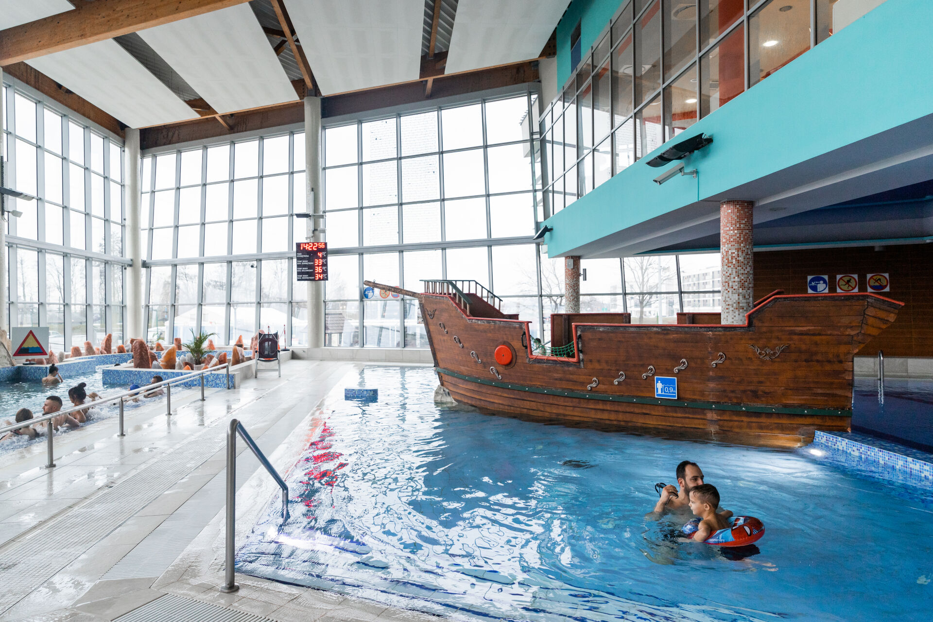 Wewnątrz Term znajduje się basen rekreacyjny ze statkiem pirackim, basen solankowo-uzdrowiskowy oraz tężnia. Kąpiele w solance wydobywanej z głębokości ponad 2 km odprężają, nawilżają i rozgrzewają skórę całego ciała, a także łagodzą zmęczenie i stres. Relaksowi sprzyjać będzie również wizyta w wyjątkowej Strefie Saun i SPA. Odwiedziny Strefy Wellness & SPA warto przypieczętować seansem w komorze śnieżnej, gdzie temperatura wynosi od -5 do -13 stopni Celsjusza. Szok temperaturowy stymuluje w organizmie wiele korzystnych reakcji, m.in. zwiększa przepływ krwi, zmniejsza napięcia mięśni, zwiększa odporność oraz przyspiesza przemianę materii.